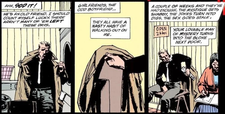 Which brings us to Hellblazer #51 (written by John Smith), in which a maudlin John muses on his loneliness. “Girlfriends, the odd boyfriend…they all have a nasty habit of walking out on me.” Lest we read that line ambiguously, he goes on to say “the jokes turn into digs, the sex goes stale” and “I’m hopeless when it comes to finishing relationships.” As of March 1992, John Constantine officially dated men.