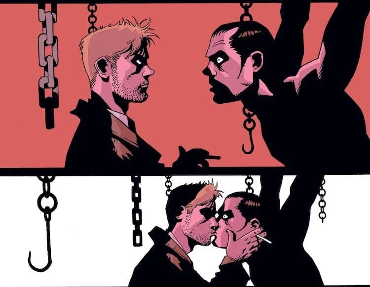 Part of what makes the portrayal of queerness in Hellblazer questionable is the Otherness of it all: John has queer friends, but John himself isn’t queer. Or is he? Before Ray Monde’s death, John’s current girlfriend asks Ray if he and John have ever slept together, a question she and Ray both consider as plausible. Later, John is attacked by a demon while he sleeps, who penetrates John’s mouth with his tongue in some extremely suggestive imagery. The demon gives John some of his own blood, causing Ray’s ghost to later tell John that he now has a form of “psychic AIDS,” which is a real yikes of a line, obviously, but further thematically aligns John with queerness. John has never been a paragon of normative heterosexual machismo.