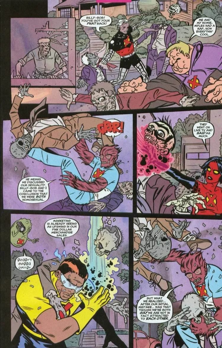This subplot continues into their next series, X-Statix, where Billy Bob is uncomfortable in the team’s communal showers and struggles to access his powers, which Myles blames on him “denying your true self.” Myles isn’t as sanguine as he pretends, though, getting drunk and describing himself and Billy Bob as “in a state of gay slash not-gay: multi-sexual cats in Schrodinger’s Box.” Finally, in X-Statix #4, they talk it out off-page and cheerfully explain to the team that they are both gay…but not for each other.