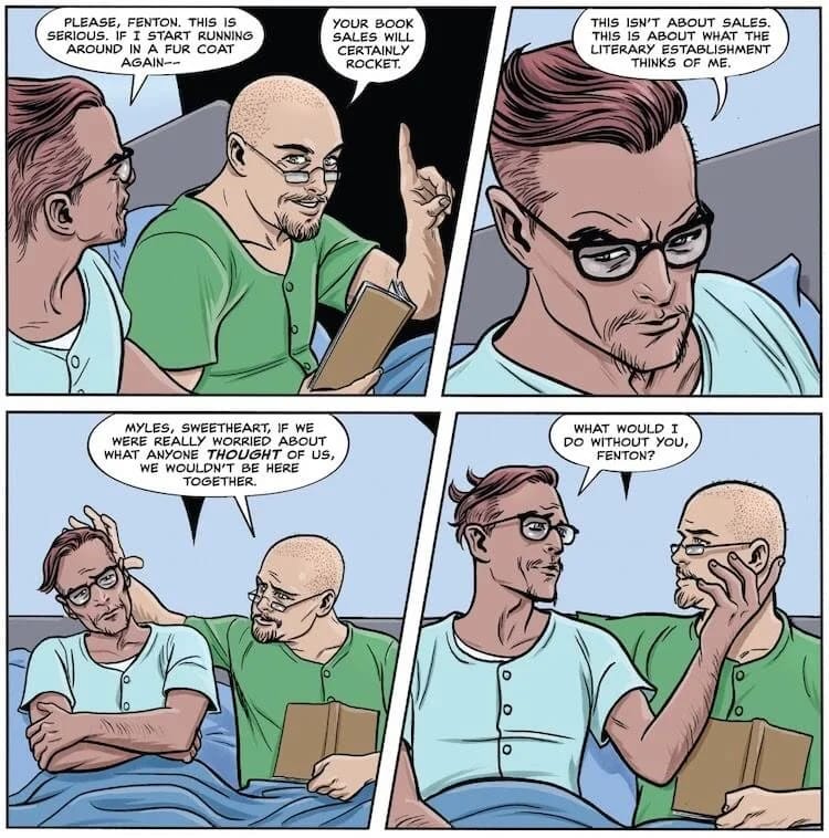 Or are they? In #129, the final issue of the series, we see them in bed together, clearly disconcerted. Later, Billy Bob reacts with angry denial and homophobic language when a reporter asks about their relationship. He tells a pissed Myles that he doesn’t want everyone knowing, even though that was the whole point, because they aren’t pretending anymore.